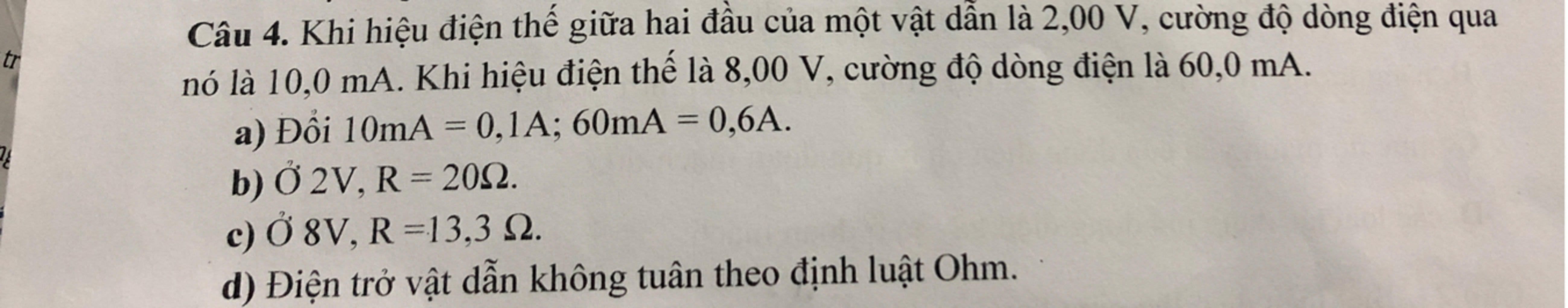 d) Do \(\dfrac{U}{I}\) không phải là một hằng số nên điện trở vật dẫn không tuân theo định luật Ôm.