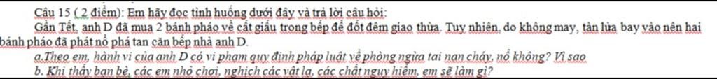 `-` Theo em hành vi của anh `D` có vi phạm quy định pháp luật về phòng ngừa tai nạn cháy nổ vì :