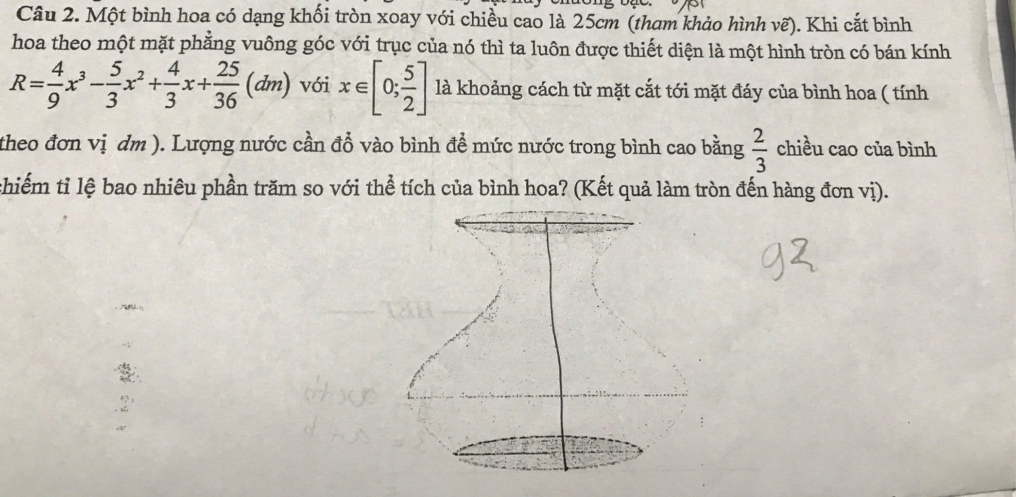 Lượng nước cần đổ vào bình để mực nước trong bình cao bằng $\dfrac23$ chiều cao của bình chiếm tỉ lệ là: