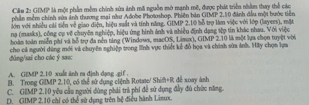 Câu 2: GIMP là một phần mềm chỉnh sửa ảnh mã nguồn mở mạnh mẽ, được phát triển nhằm thay thế các