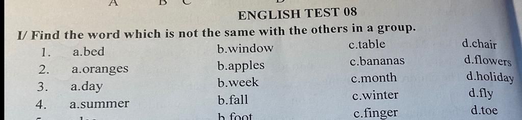 `4.` D là động từ, còn lại là danh từ chỉ các mùa