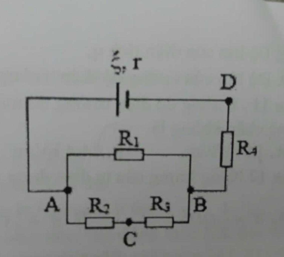 Cho mạch điện như hình vẽ. Nguồn điện có suất điện động E=9V, điện trở trong r=1 ôm. Các điện trở mạch ngoài R1=R2=R3=3 ôm, R4=6 ôm