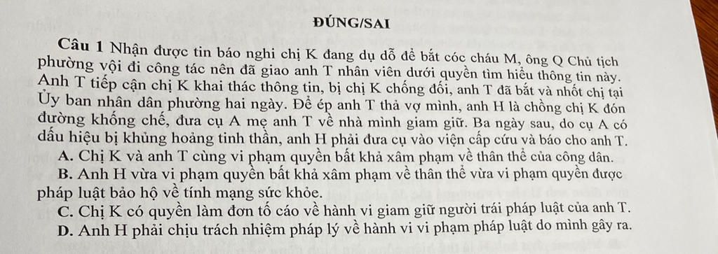 D. Đúng. Vì: `→` Anh H bắt, giam người trái phép và gây hậu quả nghiêm trọng, nên phải chịu trách nhiệm pháp lý.