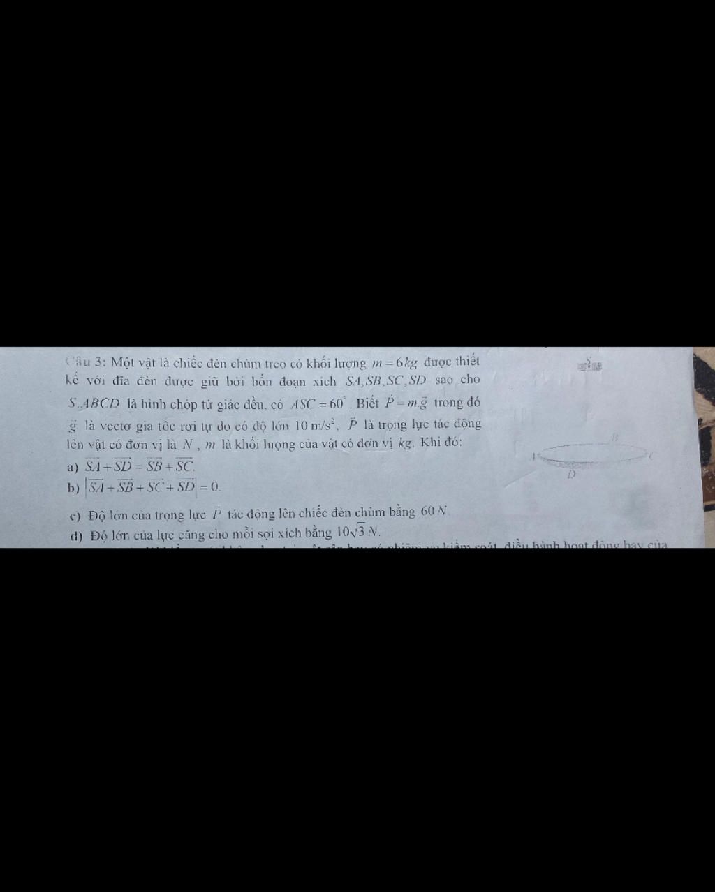 Câu 3: Một vật là chiếc đèn chùm treo có khối lượng m=6kg được thiết