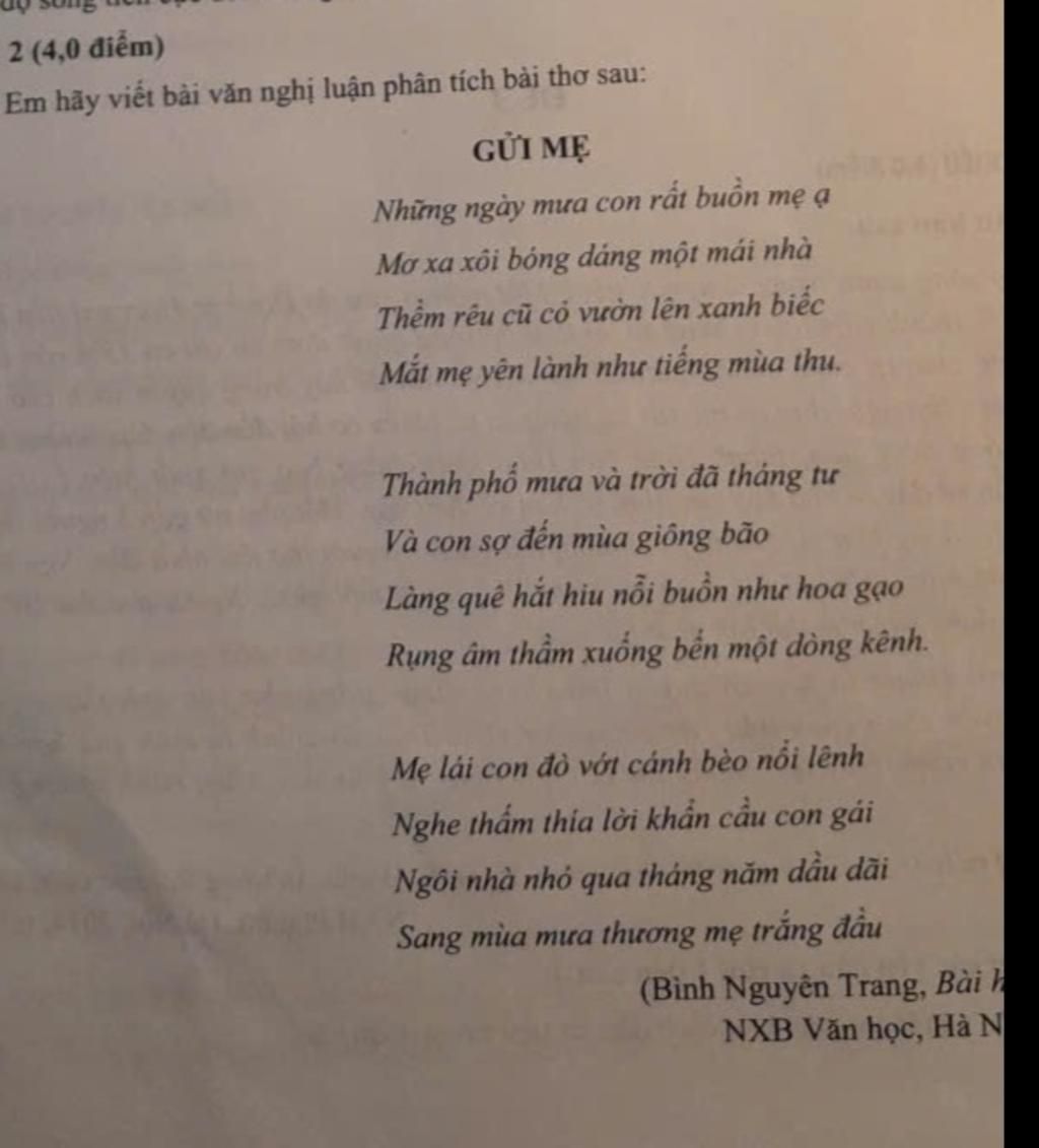 Tình cảm gia đình, đặc biệt là tình mẹ con, luôn là một đề tài quen thuộc và cảm động trong thơ ca. Bài thơ “Gửi mẹ” của nhà thơ Bình Nguyên Trang là một lời tâm sự nhẹ nhàng, sâu lắng của người con gửi về mẹ trong những ngày mưa xa quê. Qua những hình ảnh giản dị mà giàu cảm xúc, bài thơ thể hiện nỗi nhớ nhà, nhớ mẹ da diết và tình yêu quê hương sâu đậm.