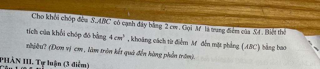 tích của khối chóp đó bằng 4 cm, khoảng cách từ điểm M đến mặt phẳng (ABC) bằng bao