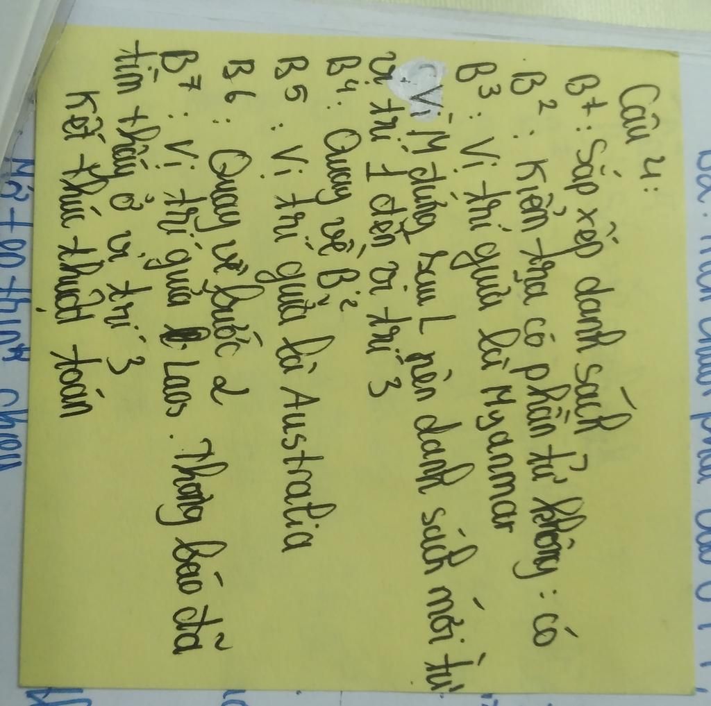 Câu 4:hãy nêu các bước của thuật toán tìm kiếm nhị phân tìm thấy "Laos" trong danh sách các nước sau: