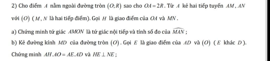 2) Cho điểm A nằm ngoài đường tròn (O;R) sao cho OA=2R.Từ A kẻ hai tiếp tuyến AM, AN