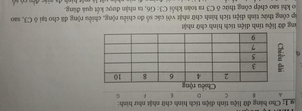 u 1: Cho bảng dữ liệu tính diện tích hình chữ nhật như hình: