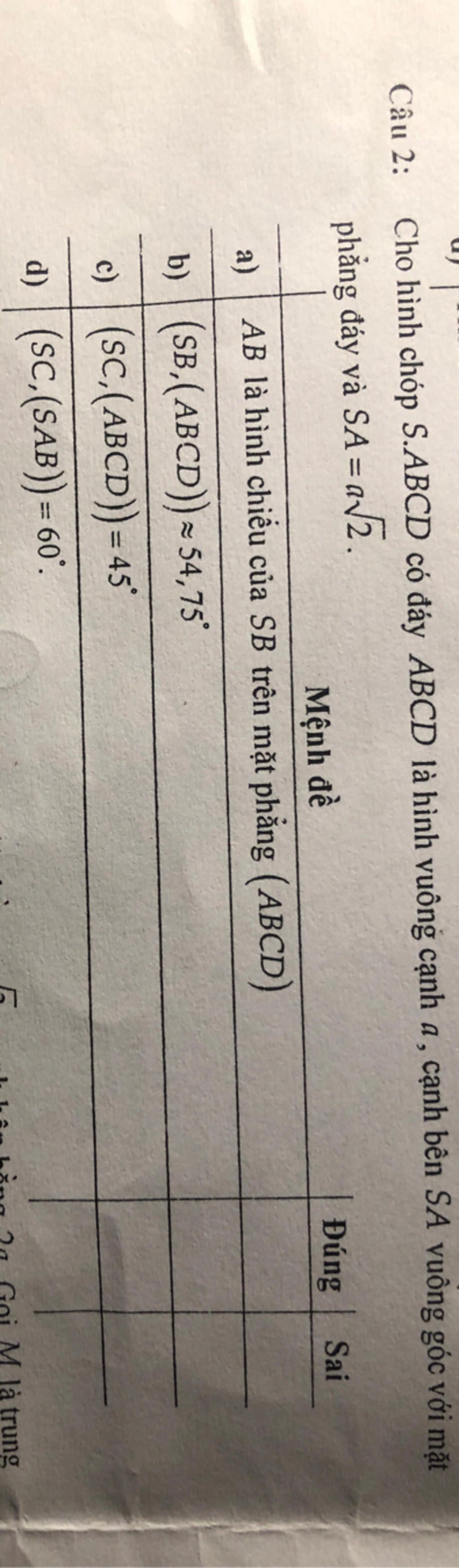 Câu 2: Cho hình chóp S.ABCD có đáy ABCD là hình vuông cạnh a, cạnh bên SA vuông góc với mặt