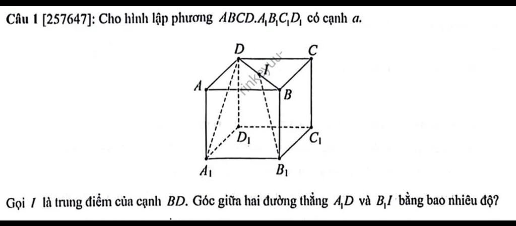 $\to \cos\widehat{IB_1C}=\dfrac{B_1I^2+B_1C^2-IC^2}{2B_1I\cdot B_1C}=\dfrac{(\dfrac{\sqrt{3}a}{\sqrt{2}})^2+(\dfrac{a\sqrt2}2)^2-(\dfrac{a\sqrt2}2)^2}{2\cdot \dfrac{\sqrt{3}a}{\sqrt{2}}\cdot \dfrac{a\sqrt2}2}=\dfrac{\sqrt{3}}{2}$