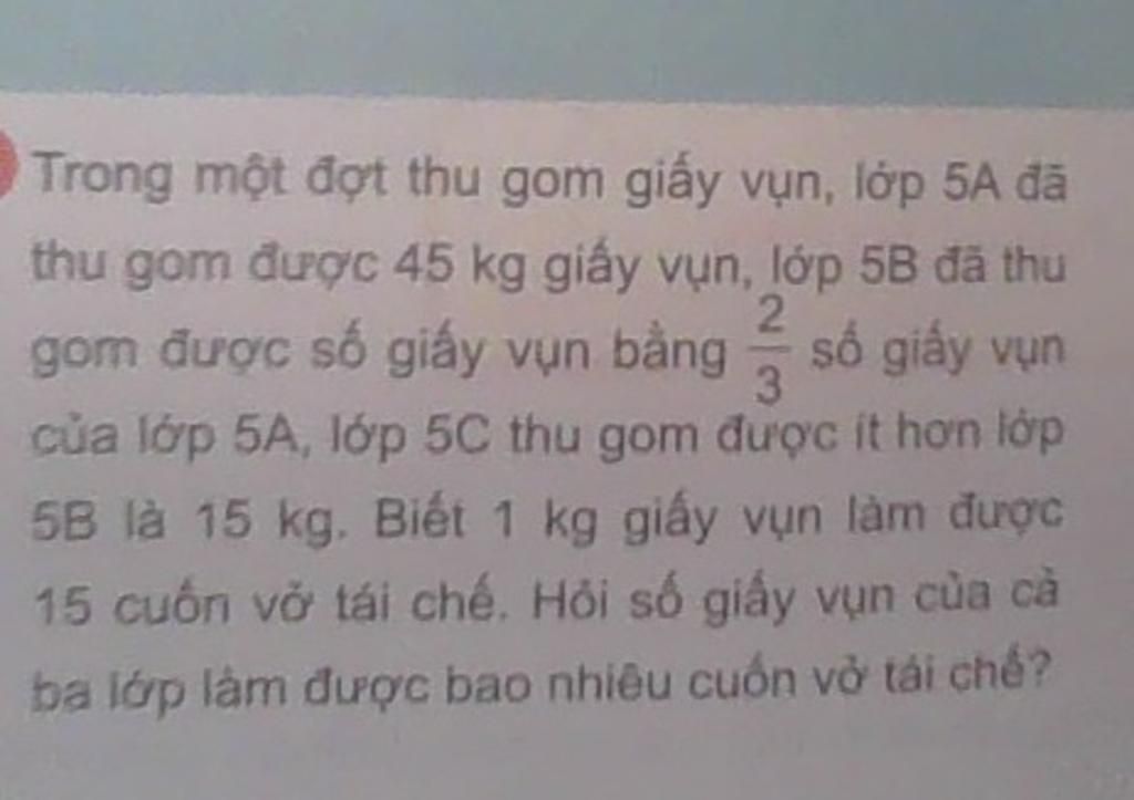 Số giấy vụn của cả ba lớp làm được số cuốn vở tái chế là:
