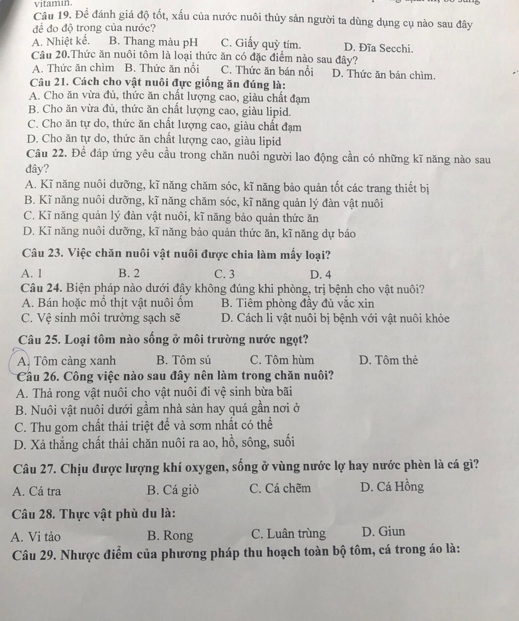 Câu 24: A. Bán hoặc mổ thịt vật nuôi ốm