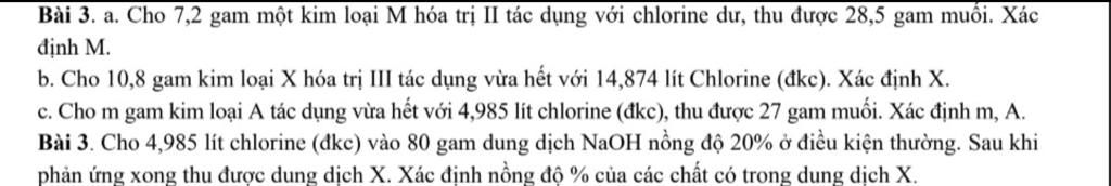 Bài 3. a. Cho 7,2 gam một kim loại M hóa trị II tác dụng với chlorine dư, thu được 28,5 gam muối. Xác