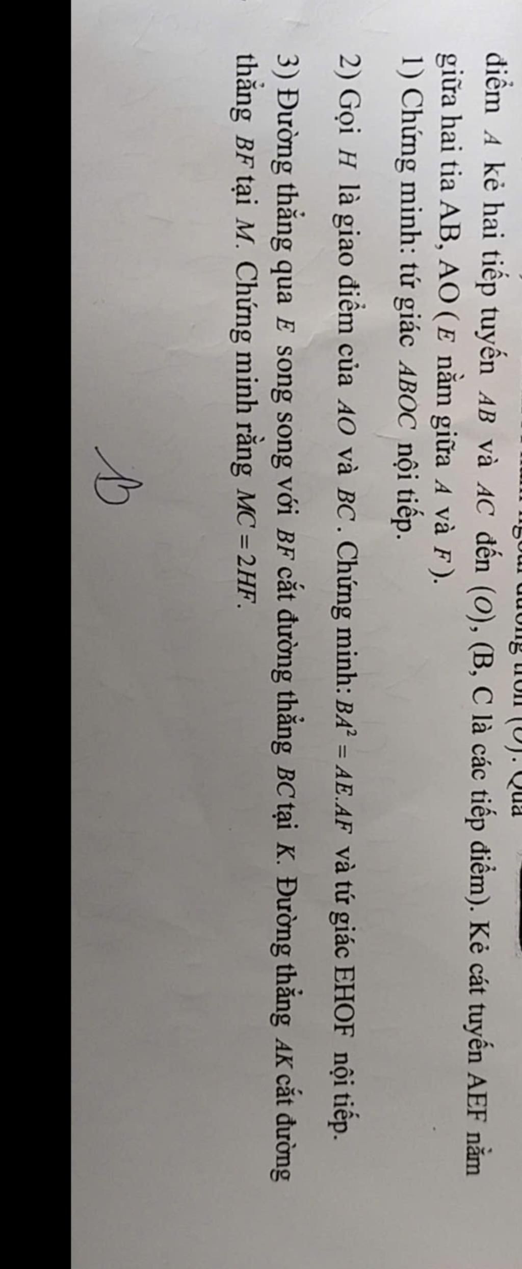 điểm A kẻ hai tiếp tuyến AB và AC đến (O), (B, C là các tiếp điểm). Kẻ cát tuyến AEF nằm