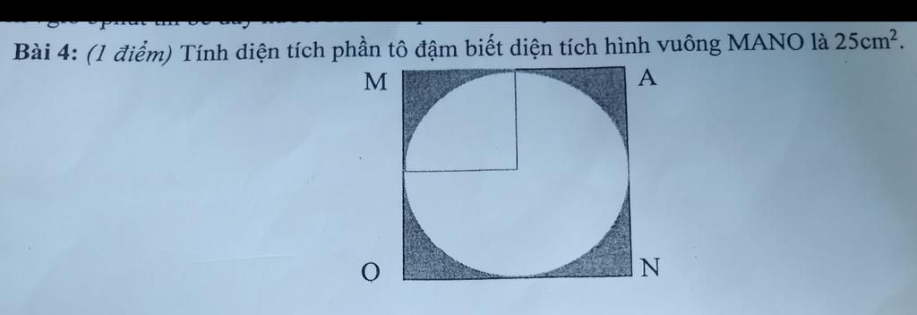 Vậy diện tích phần tô đậm là: 25 - 19.63 ≈ 5.37 ( cm² )
