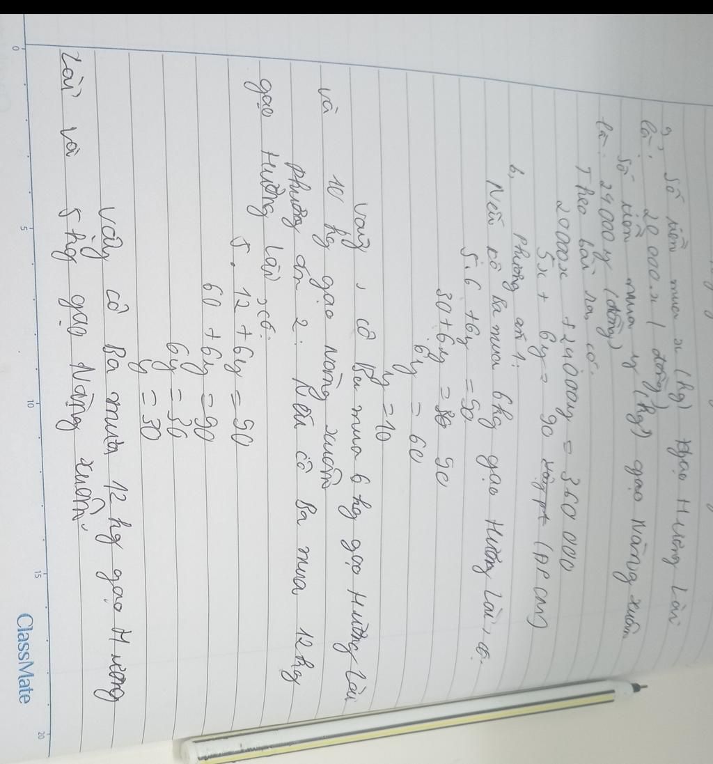 a, viết phương trình ẩn x;y biểu thị số tiền cô Ba mua 2 loại gạo, biết bà Ba mua hết 360.000 đồng