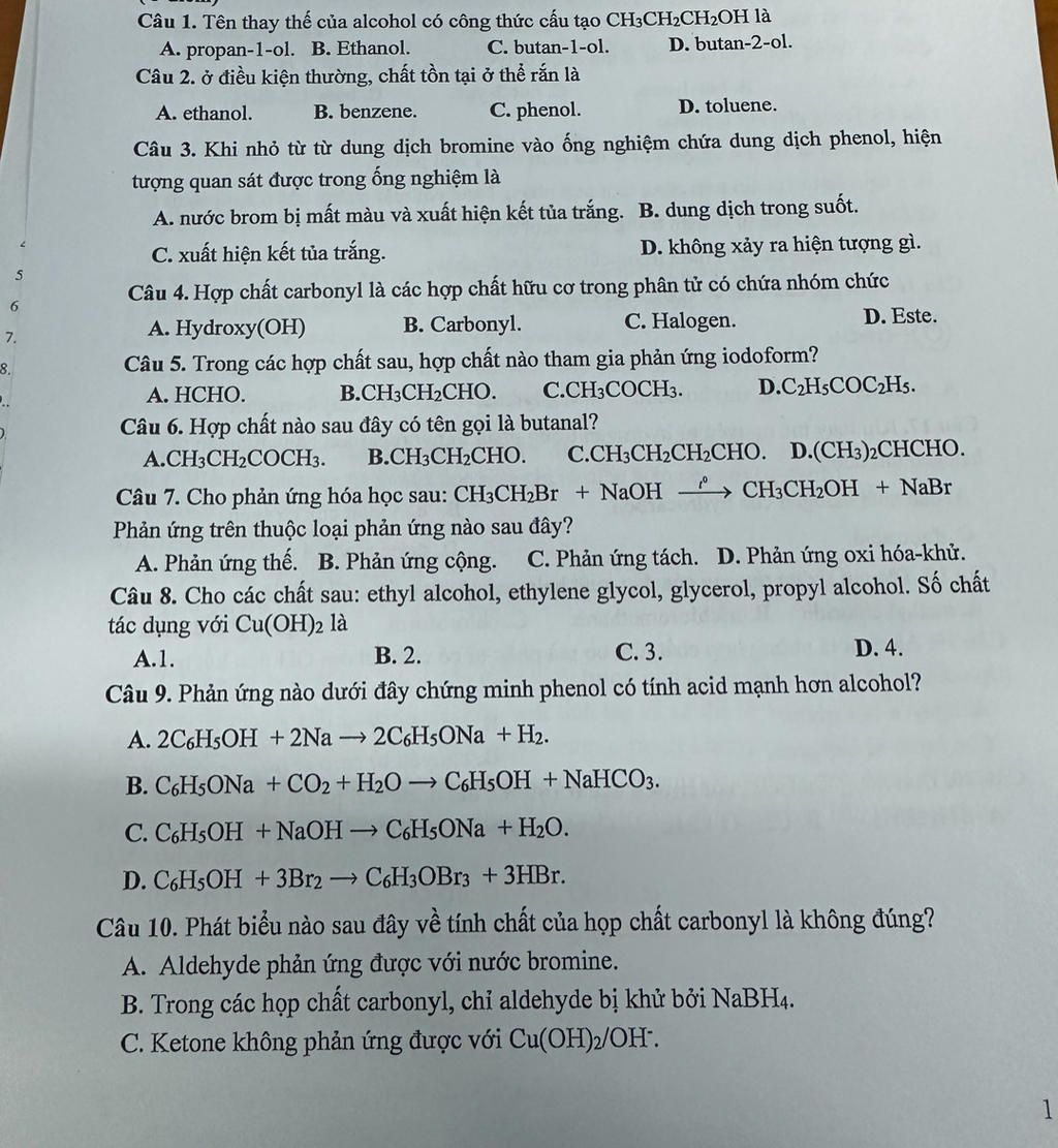 Câu 9: C. Phenol tác dụng được với kiềm còn alcohol thì không