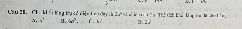 `+)` `\text{V}`lăng trụ `=` `\text{S}`đáy . h `=``3a^2 . 2a` `=` `6a^3`