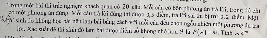 Để điểm số không nhỏ hơn 9 thì bạn đó cần làm đúng 19 câu hoặc 20 câu