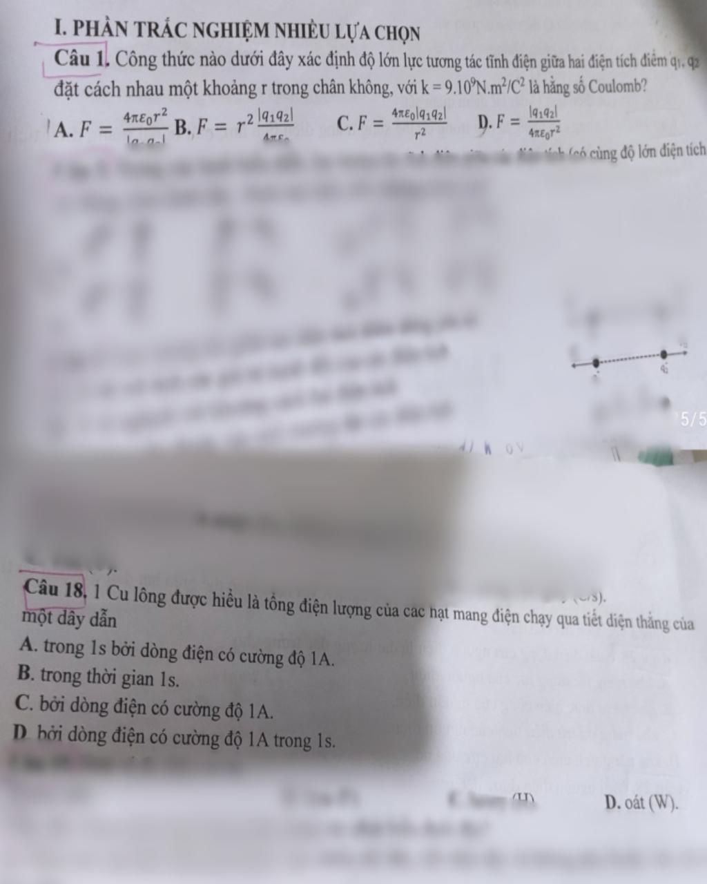 `-> q = I.t : 1` Cu lông là tổng điện lượng các hạt mang điện chạy qua tiết diện thẳng của dây dẫn trong `1s` bởi cường độ dòng điện `1A`