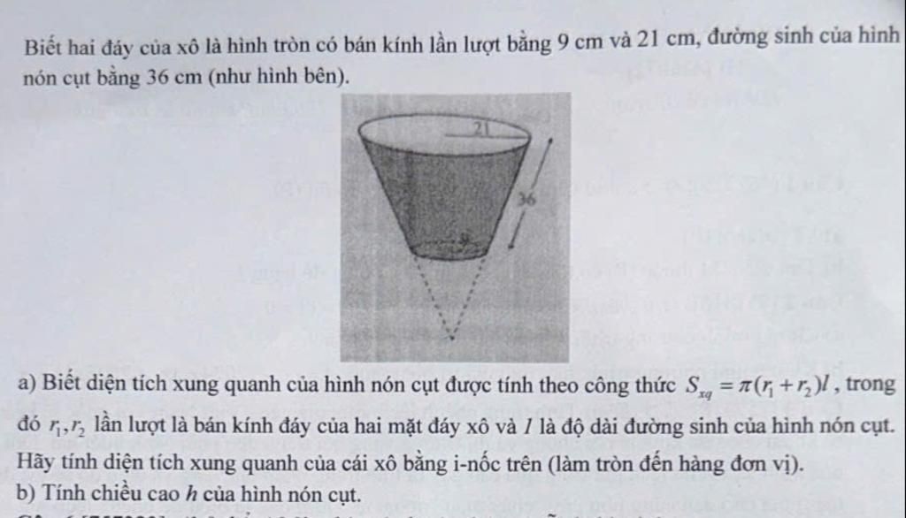 Từ một hình thang vuông đáy lớn `r_1=21cm,` đáy bé `r_2=9cm,` đường cao `h` và cạnh bên `l=36cm`