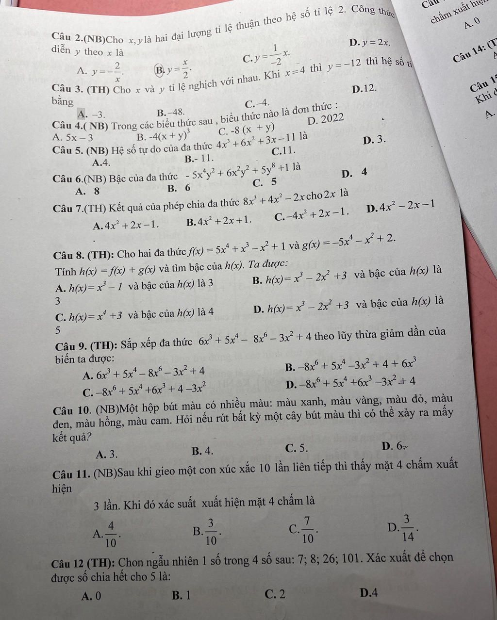 Câu 3. (TH) Cho x và y tỉ lệ nghịch với nhau. Khi x=4 thì y= -12 thì hệ số 1