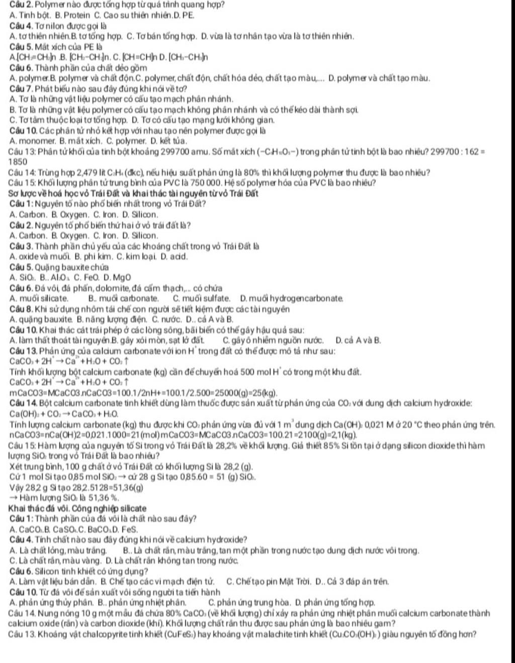 Câu 2. Polymer nào được tổng hợp từ quá trình quang hợp?