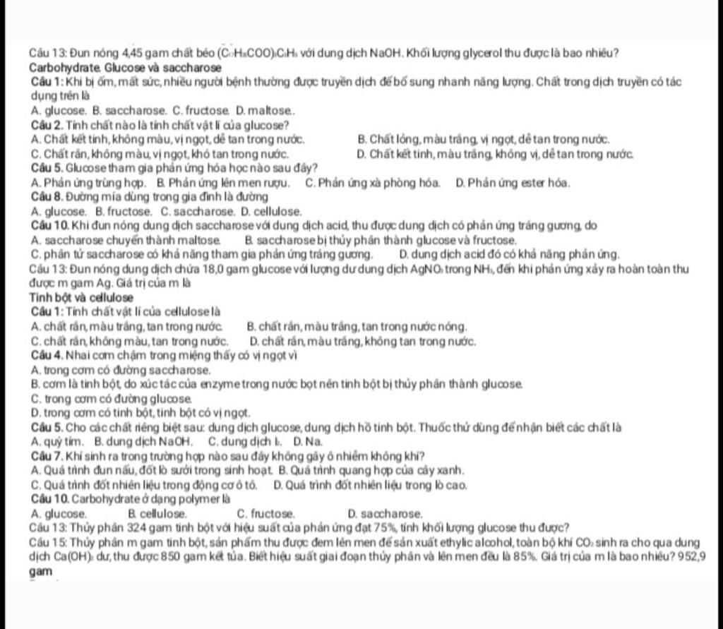 Câu 1:Khi bị ốm, mất sức, nhiều người bệnh thường được truyền dịch để bổ sung nhanh năng lượng. Chất trong dịch truyền có tác