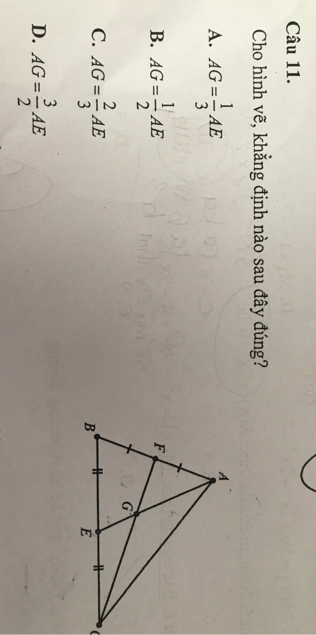 `=>(AG)/(AE)=2/3` hay `AG=2/3 AE`