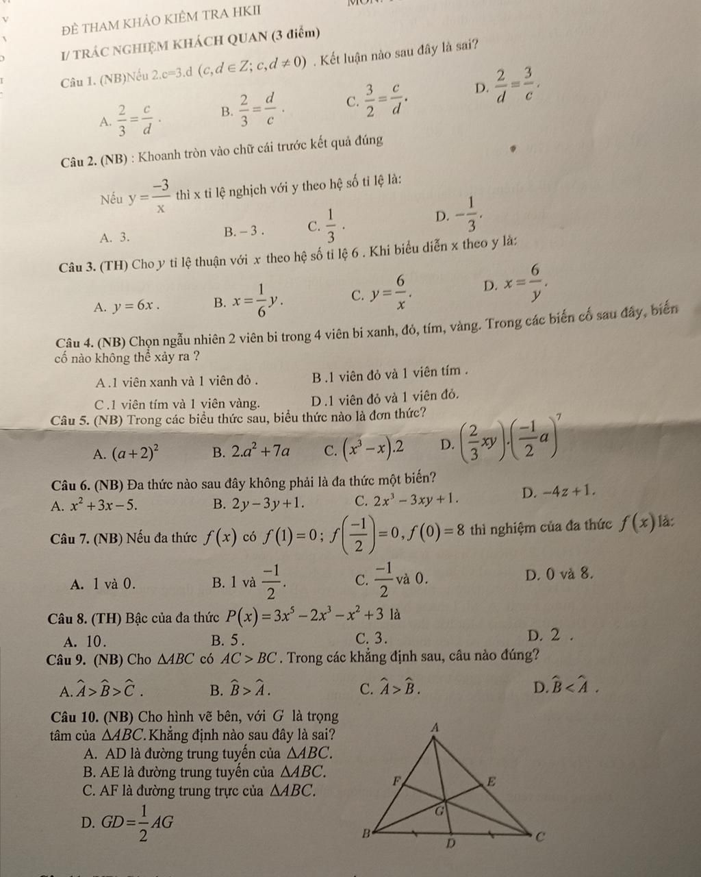 I/ TRÁC NGHIỆM KHÁCH QUAN (3 điểm)