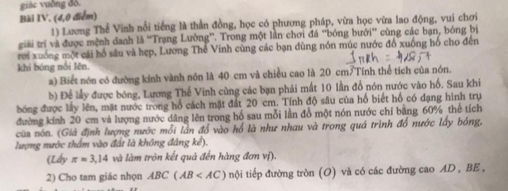 Nước sau khi đổ `10` nón nước vào hố có dạng hình trụ đường kinh `20\ cm`
