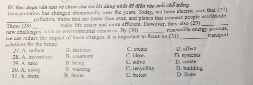 Câu 27 chọn A vì xe điện đc nhắc đến như một tiến bộ tích cực, nên hành động phù hợp nhất là "reduce"