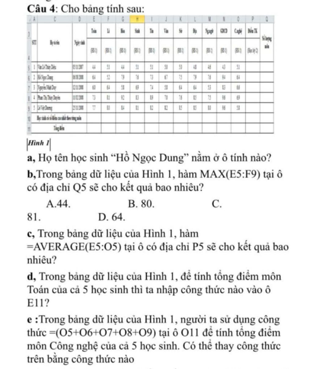 `e)` `(O5+O6+O7+O8+O9)` `=>` tính tổng điểm môn Công nghệ (cột O) của 5 học sinh *
