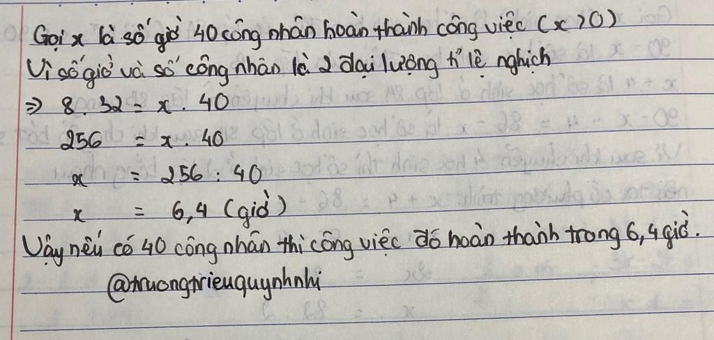 Vậy `40` công nhân hoàn thành công việc đó trong `6,4` giờ