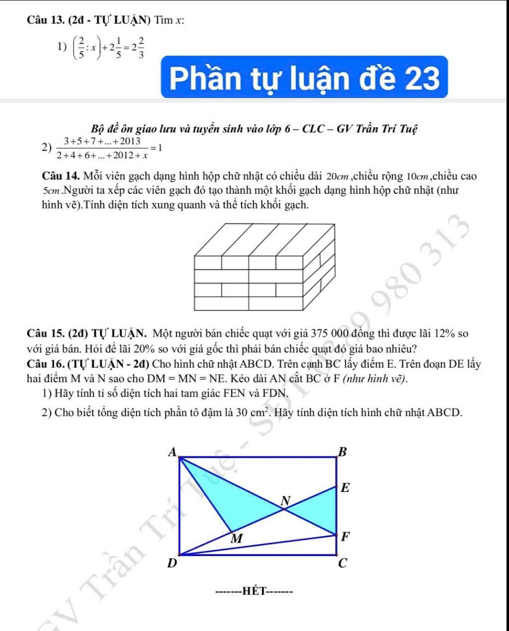 Câu 15. Một người bán chiếc quạt với giá 375 000 đồng thì được lãi 12% so với giá bán. Hỏi để lãi 20% so với giá gốc thì phải bán chiếc quạt đó giá bao nhiêu?