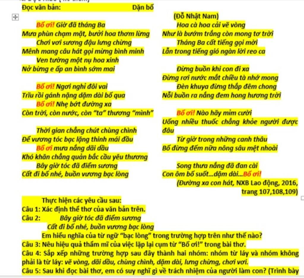 `+` Cụm từ " Bố ơi!" được điệp đi điệp lại nhiều lần xuyên suốt bài thơ đã gợi lên sự quan tâm, lo lắng và những lời gắm gửi của nhân vật trữ tình với người bố của mình. Người con mong muốn bố hãy tận hưởng cuộc sống tươi đẹp, gạt bỏ bớt những nỗI lòng, phiền muộn và lo toan về cuộc sống. Con mong bố không phải vất vả sớm tối, suốt ngày lam lũ, mưa nắng dãi dầu, và hơn hết là luôn được mạnh khoẻ.