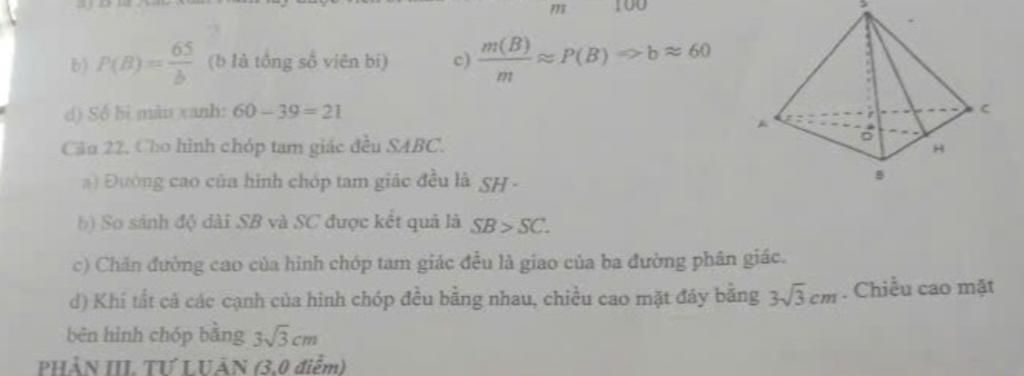 d) Khi các cạnh của hình chóp bằng nhau `to` Tam giác ở đáy và tam giác ở cạnh bên bằng nhau `to` Độ dài đường trung tuyến/Đường cao/Đường trung trực/Đường phân giác bằng nhau