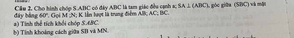 Câu 2. Cho hình chóp S.ABC có đáy ABC là tam giác đều cạnh a; SA L (ABC), góc giữa (SBC) và mặt