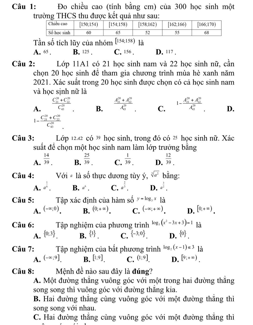 Câu 1:Đo chiều cao (tính bằng cm) của 300 học sinh một trường THCS thu được kết quả như sau: