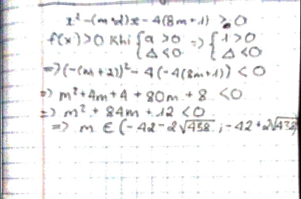 Với giá trị nào của tham số m thì bất phương trình x^2-(m+2)x -4(8m+1) là tam thức bậc hai dương với mọi x thuộc R