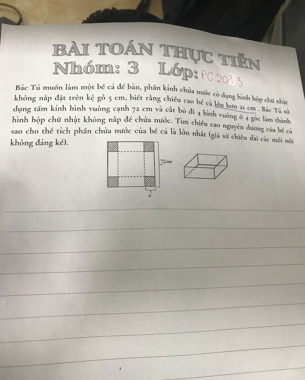`=>` Chiều cao nguyên dương của bể cá là `22(cm)`