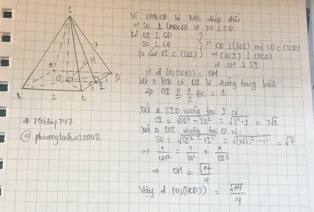 cho hình chóp đều SABCD có cạnh đáy bằng 2 cạnh bên bằng 3. tính khoảng cách từ O đến mặt phẳng SCD