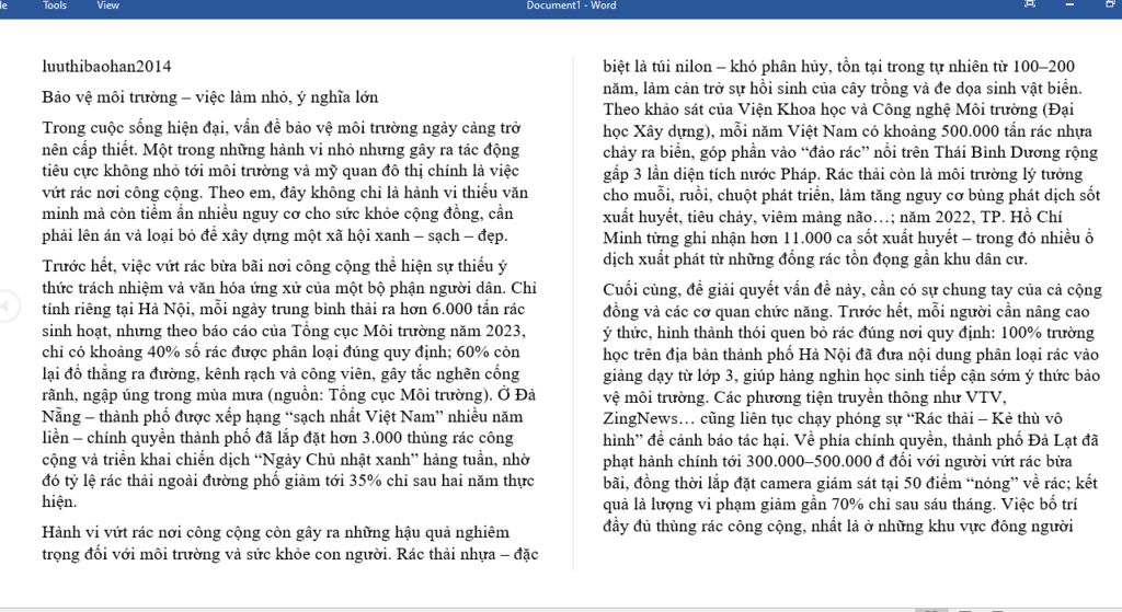 Trong cuộc sống hiện đại, vấn đề bảo vệ môi trường ngày càng trở nên cấp thiết. Một trong những hành vi nhỏ nhưng gây ra tác động tiêu cực không nhỏ đến môi trường và mỹ quan đô thị chính là việc vứt rác nơi công cộng. Theo em, đây là một hành vi thiếu văn minh, cần phải lên án và loại bỏ để xây dựng một xã hội xanh, sạch, đẹp.