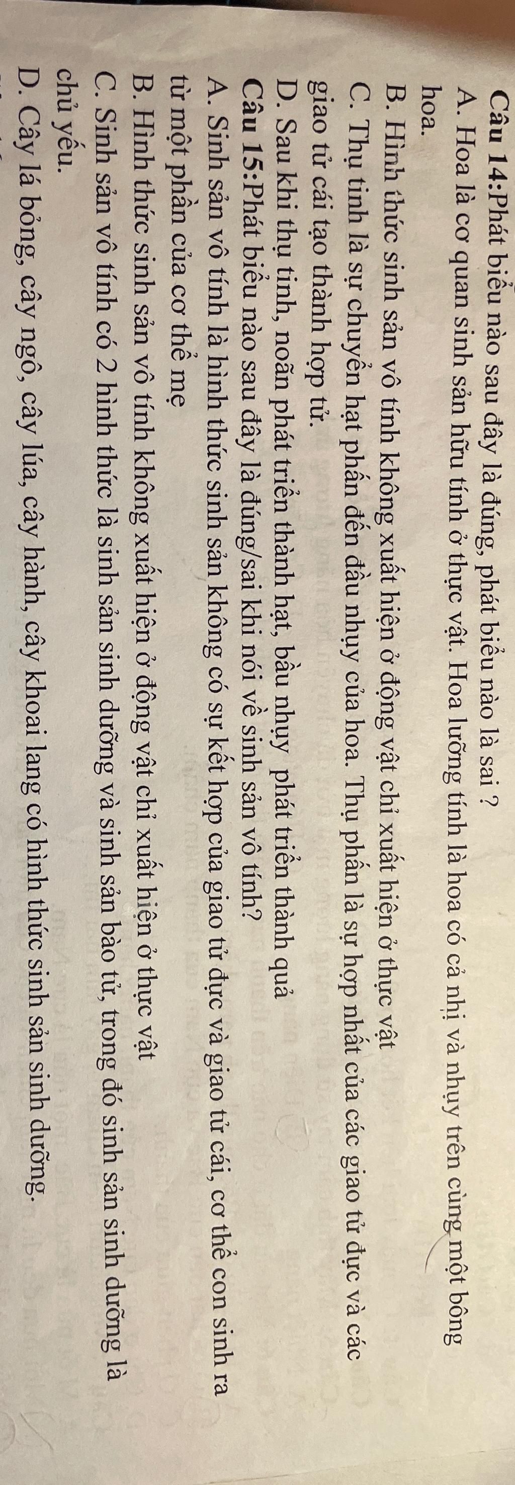 `=>` Hoa chứa các bộ phận sinh sản (nhị là bộ phận đực, nhụy là bộ phận cái). Hoa lưỡng tính có cả nhị và nhụy.