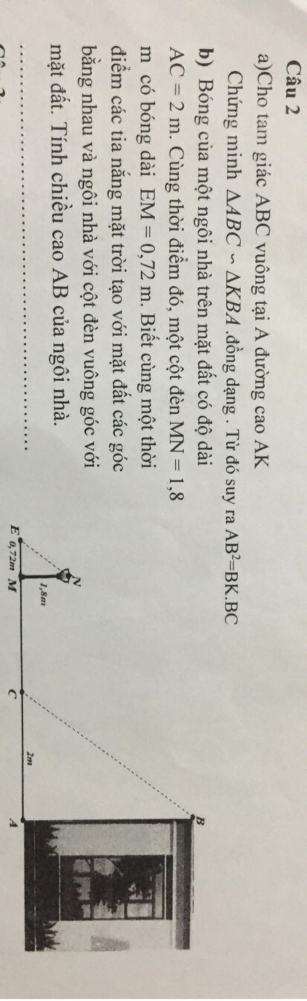 AC = 2 m. Cùng thời điểm đó, một cột đèn MN = 1,8