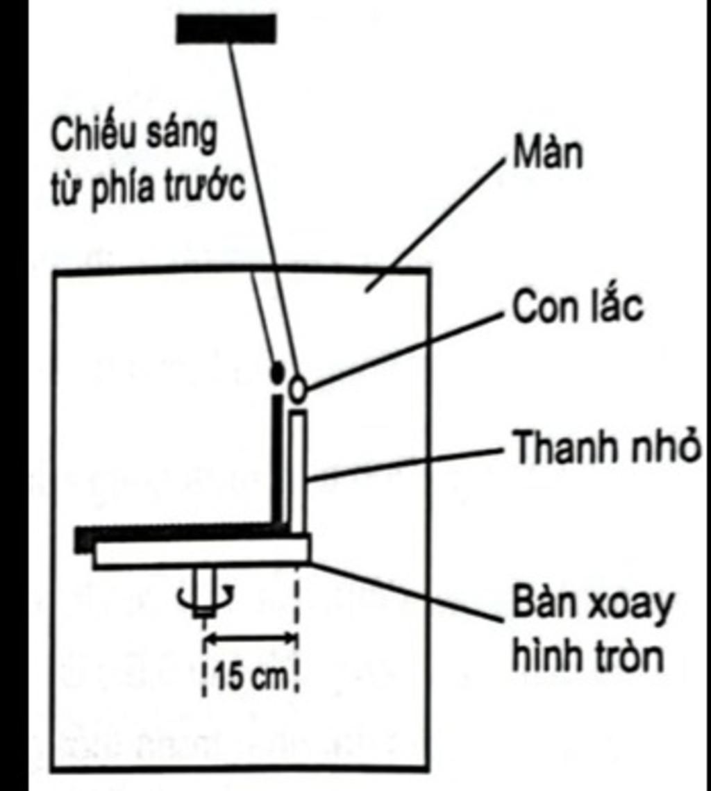 Hình vẽ là sơ đồ của một bàn xoay hình tròn, có gắn một thanh nhỏ cách tâm bàn 15cm. Bàn xoay được chiếu sáng từ bên cạnh phía trước màn để bóng đổ lên màn hình. Một con lắc đơn được đặt sau bàn xoay và làm cho dao động điều hoà với biện độ bằng khoảng cách từ thanh nhỏ đến tâm bàn xoay. Tốc độ của bàn quay được điều chỉnh là 20pi ( rad/s) và bóng của thanh nhỏ luôn trùng với bóng của con lắc trên màn hình