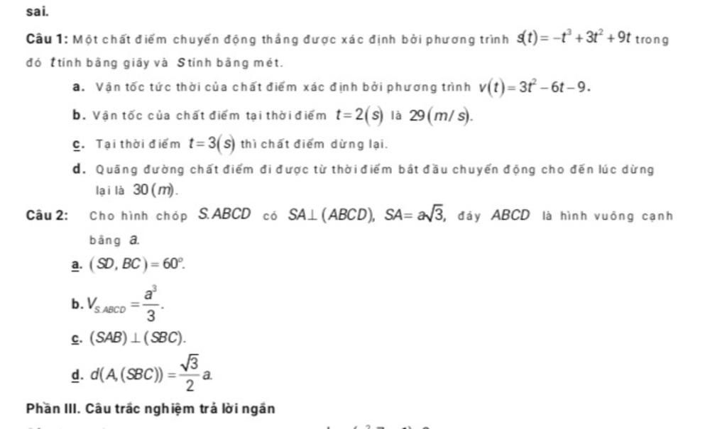 Câu 1: Một chất điểm chuyển động thẳng được xác định bởi phương trình st)= t +31 +9t trong