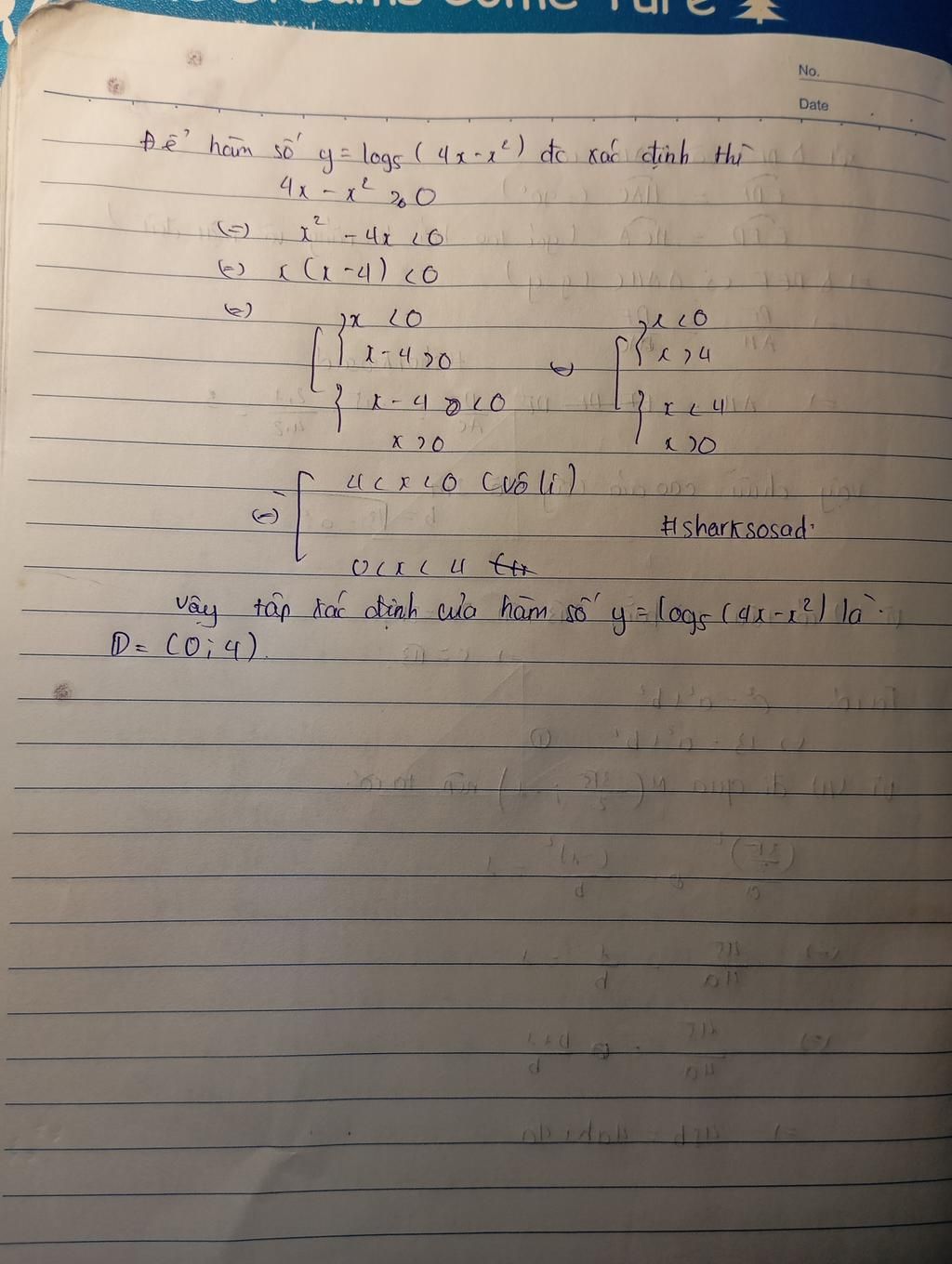 `=>` tập xác định của hàm số là `D =(0;4)`
