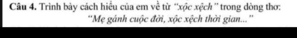=> Từ "xộc xệch' có thể hiểu theo những nét nghĩa hàm ẩn nhưng dù hiểu theo cách nào thì câu thơ cũng mang một nỗi nghẹn ngào: mẹ không chỉ gánh "cuộc đời" của mình mà còn gánh cả những nhọc nhằn vì con và gia đình. "xộc xệch" trở thành biểu tượng của sự hy sinh lặng lẽ và vẻ đẹp tàn phai theo năm tháng của người phụ nữ giàu đức hi sinh